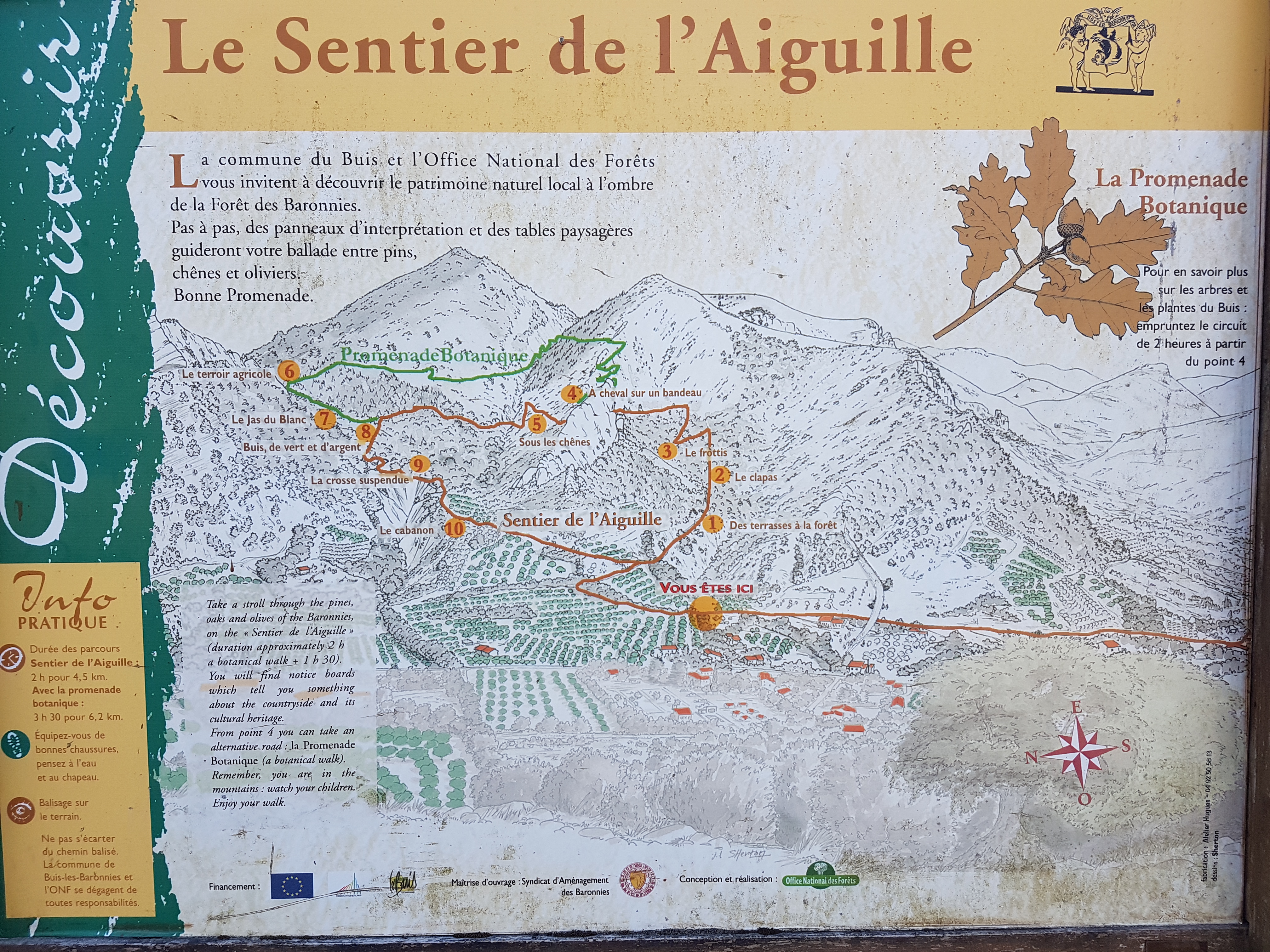 Commence une visite à pied à partir d'ici : Sentier Botanique de l'Aiguille. Une marche de 5,5 km jusqu'au sommet. Des paysages magnifiques, des vues sur le Mont Ventoux, et pour les amoureux de la flore de nombreux panneaux expliquant les arbres et buissons. Seulement en français cependant... Nous avons fait la balade depuis le camping (garez votre voiture aux Villages Vacances). Suivez les panneaux jaunes 'Sentier Botanique'. Cela a pris environ 3 heures, arrêts compris. Nous étions avec 2 enfants de 5 et 8 ans. Ah et à votre retour, rafraîchissez-vous dans le petit ruisseau à côté de l'entrée des villages !