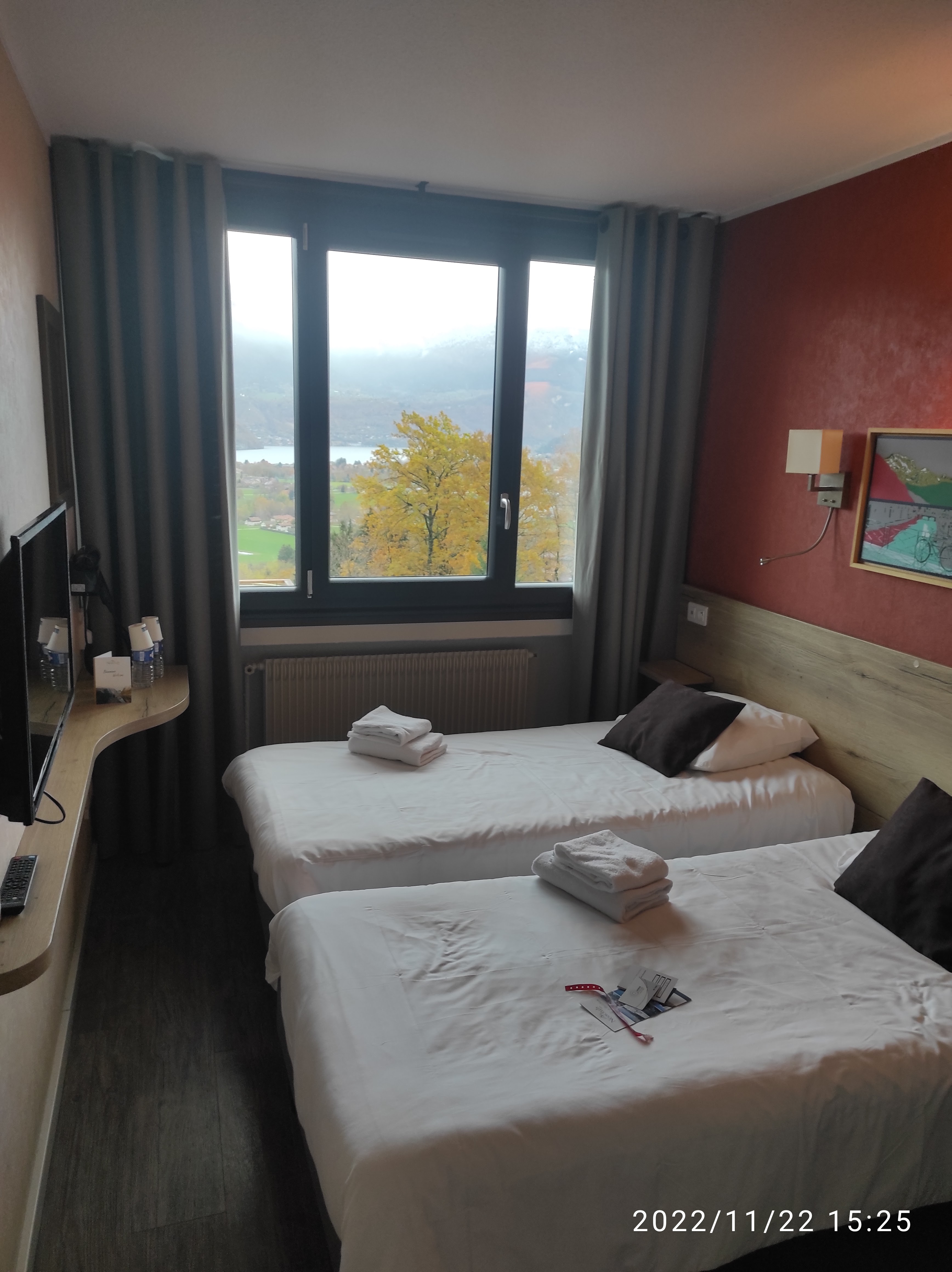 Point positif.la vue magnifique sur le lac,la restauration,les places de parking,du personnels professionnel.les chambres rénovées mais petites.le tunnel.point négatif l accueil a l arrivée qui a franchement tardé.pas de sommier dans les lits.le bruit de la route si fenêtre entrebailler la nuit bâtiment annexe. Dans l ensemble corect