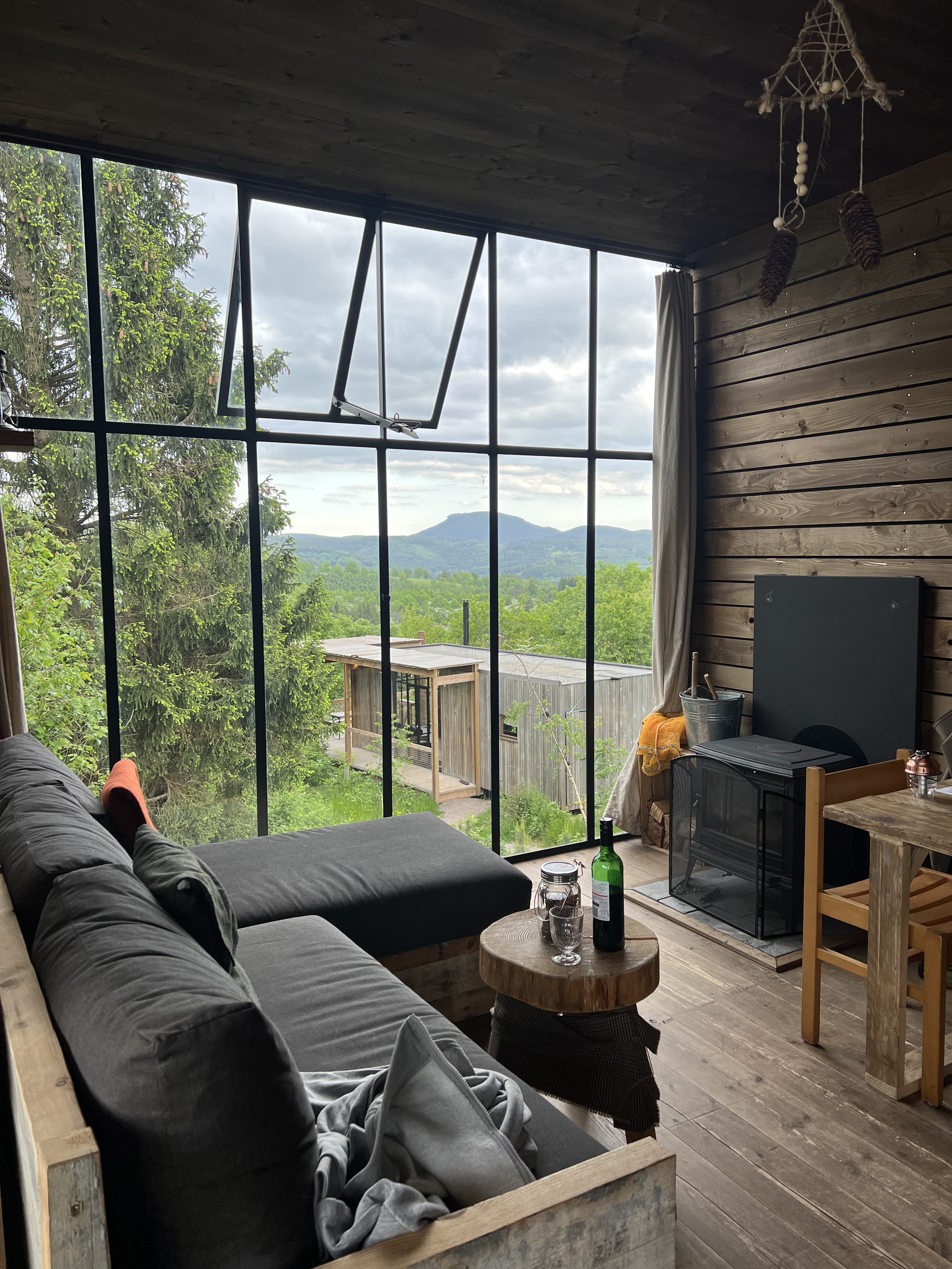 Un lieu très agréable pour qui souhaite se couper un peu du monde pour un temps. Cabane en bois, éclairage bougies et lampes à huile, poêle à bois pour le chauffage et grandes baies vitrées donnant sur les monts alsaciens ! Cuisine bois brute très jolie avec tout se qu'il vous faut pour faire à manger et réchauffer votre plat sur le poêle à bois ! C'est simple sans fioritures, mais le confort est là. Les matelas, couettes et oreillés sont d'excellente qualité. Confortables, chauds et douillets (bien mieux que certains soit disant bons hôtels !). Les services y sont présents puisque vous pouvez commander à votre convenance les petits déjeuners (choix en fonction de vos goûts), diners, kit BBQ... Ce que je trouve très intéressant c'est que l'offre provient exclusivement de la filière local (les viandes, jus de fruits, charcuteries, vins, bières... tout !). Le personnel est aux petits soins, l'équipe est formidable et à l'image du concept : elle se met en quatre pour vous satisfaire ! Conseil judicieux : veillez à arriver aux heures prévues pour le check-in, la réception n'est pas ouverte 24/24 ce serait dommage d'attendre longtemps pour rien... Les équipes ont le droit de se reposer ;-)... vous êtes venu pour cela aussi ! Vous voulez vous déconnecter un peu ? faire une cabane en bois dans la forêt avec vos enfants, leur apprendre à faire un feu ''safe'', trouver des champignons et les cuisiner le soir ?. L'endroit idéal pour cela.