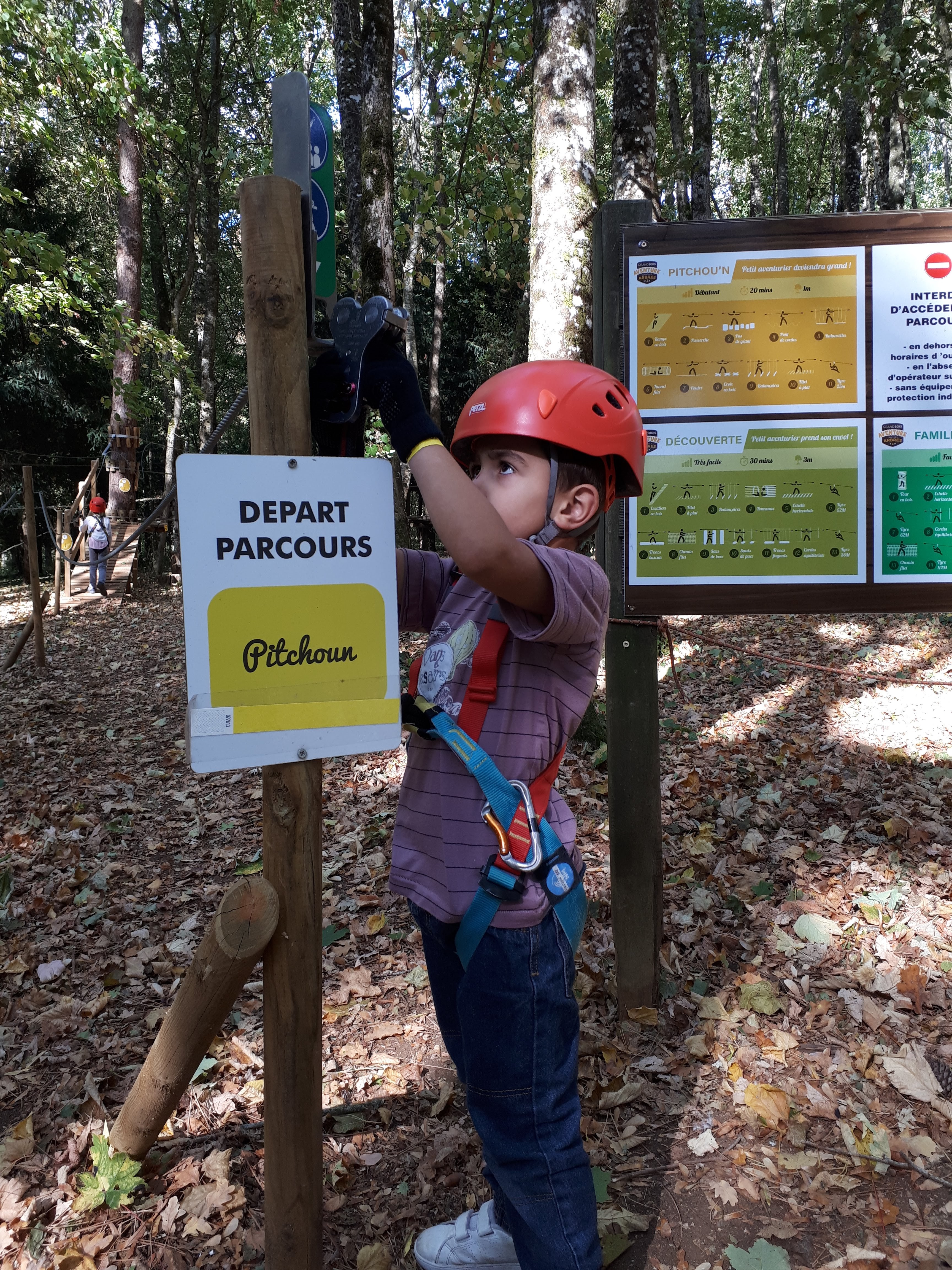 Journée inoubliable. Parc aventure très bien aménagé. Plusieurs parcours de niveau différent. Pour famille et expérimentés. Tyrolienne très longue : 350 M. Un aller et un retour. 7 parcours de niveau différent. Parc de 5 hectares. Journée d'acrobate assurée.