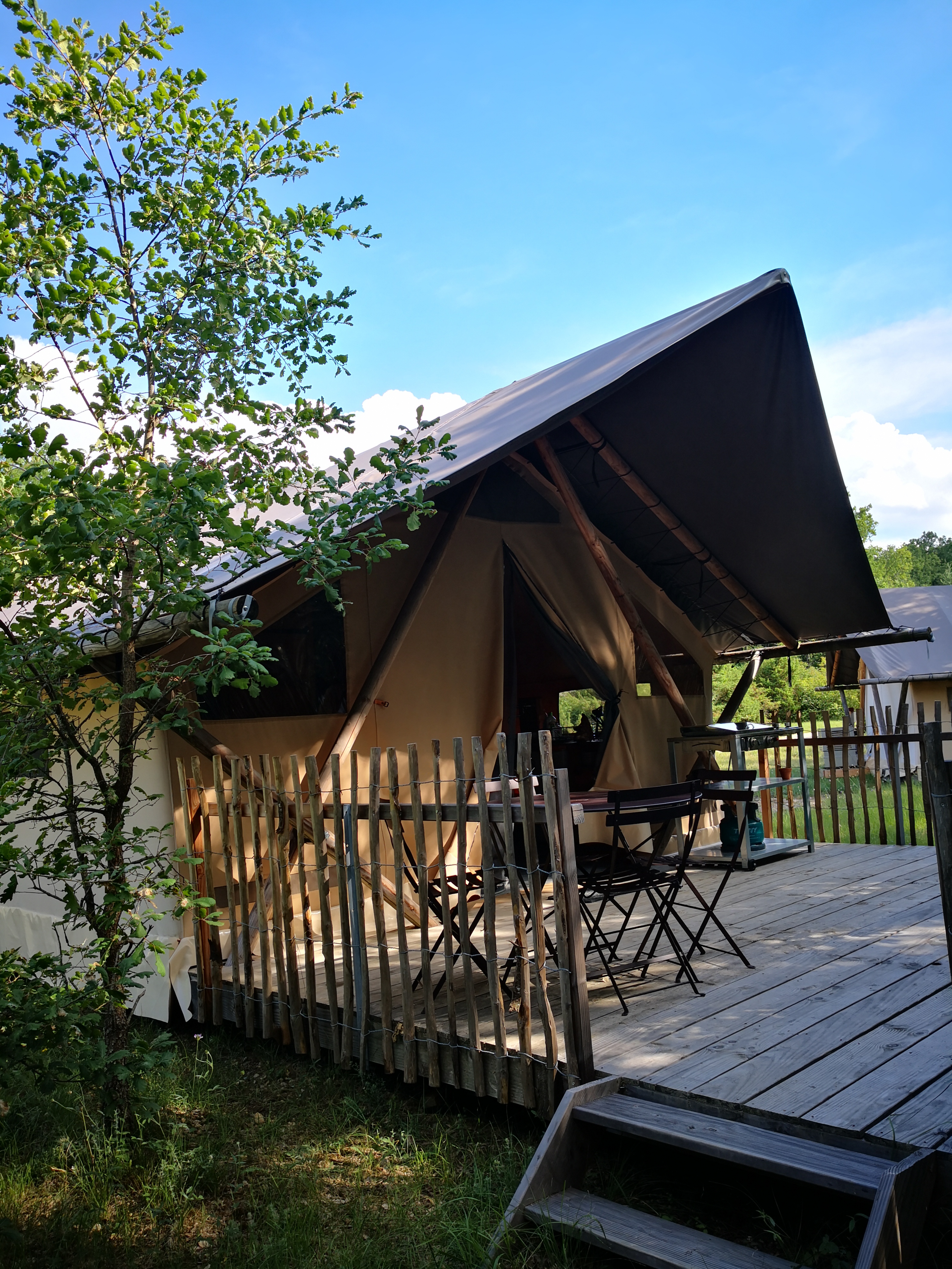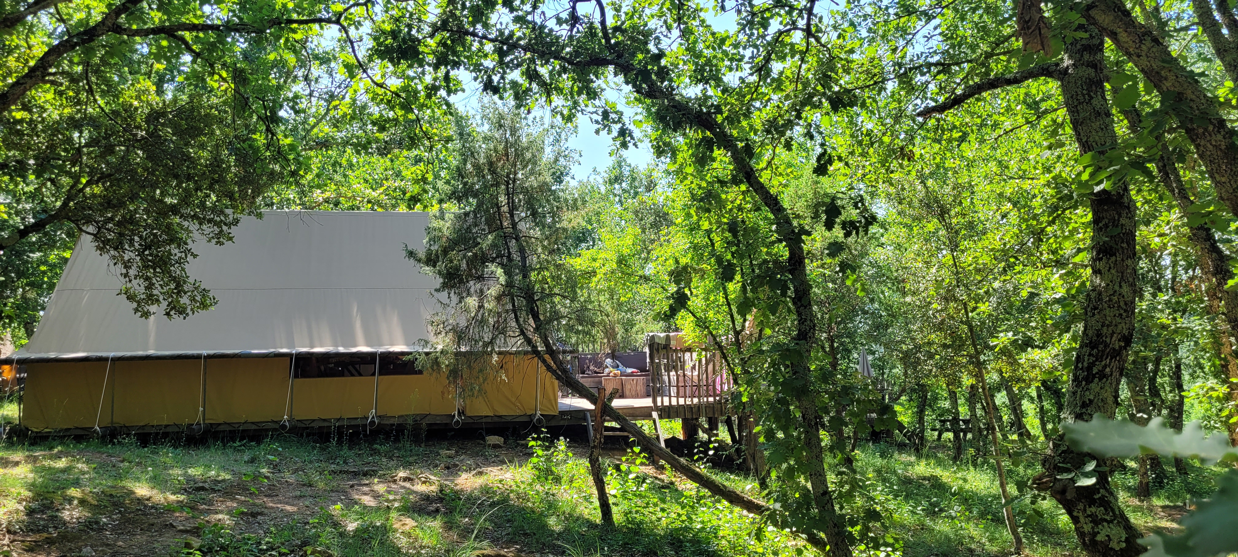 Vraiment chouette camping dans une tente au fin fond dans la forêt tranquille paisible les parties communes sont très sympas le bar le resto la piscine très bien passé pour visiter la région. Après j'y suis allé en dehors des périodes de vacances d'où le tarif assez intéressant je suis quand même assez choqué des tarifs des tentes pour le mois de juillet août plus cher que certains hôtels